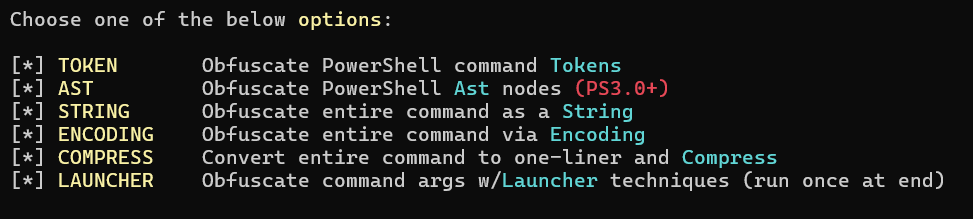 | TOKEN | Obfuscates PowerShell tokens (keywords, operators, cmdlets) by splitting, concatenating, or reordering them. | New-Object → N+ew-Ob+ject |